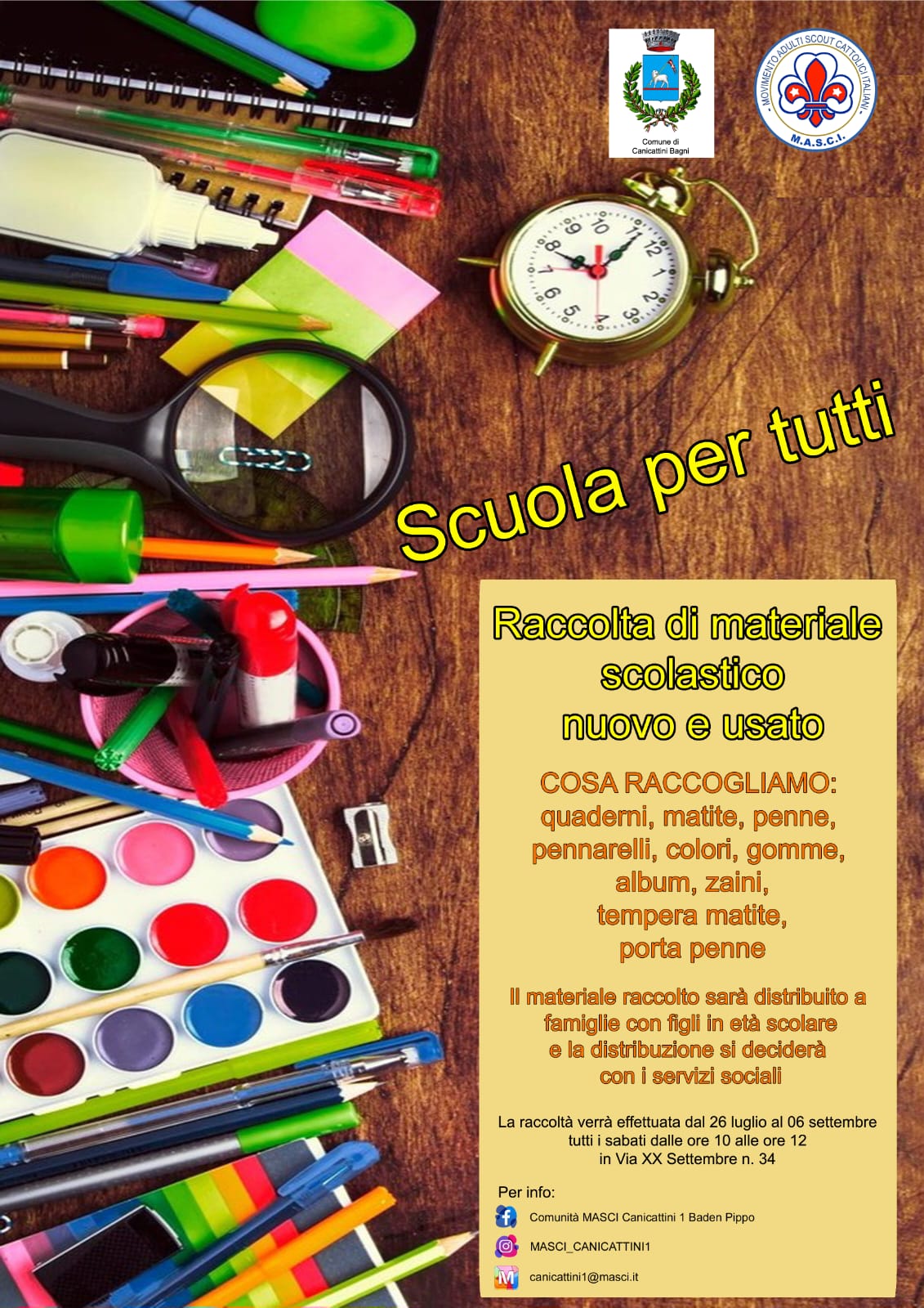 La raccolta di quaderni, matite, penne, pennarelli, colori, gomme, album, zaini, porta penne, fogli da disegno, si effettua sino al 6 settembre 2025, dalle ore 10:00 alle ore 12:00, tutti i sabati presso la sede del MASCI in via XX Settembre 34 (Palazzo Messina Carpinteri sotto la Biblioteca comunale).