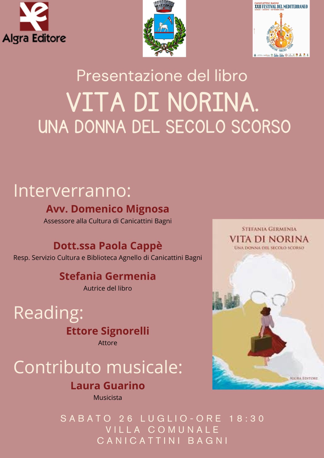 Sabato 26 luglio 2025, ore 18:30, a cura dell’Assessorato alla Cultura guidato dall’Assessore Domenico Mignosa, alla Villa Comunale, ritornata a fare da scenario e palcoscenico per gli eventi e le manifestazioni dei canicattinesi dopo i lavori di riqualificazione, piantumazione di nuove piante e la messa in sicurezza con un nuovo impianto elettrico e l’installazione di lampade a LED a basso consumo energetico, si presenta l’ultimo romanzo della scrittrice floridiana Stefania Germenia “Vita di Norina. Una donna del Novecento” (Algra editore 2025).