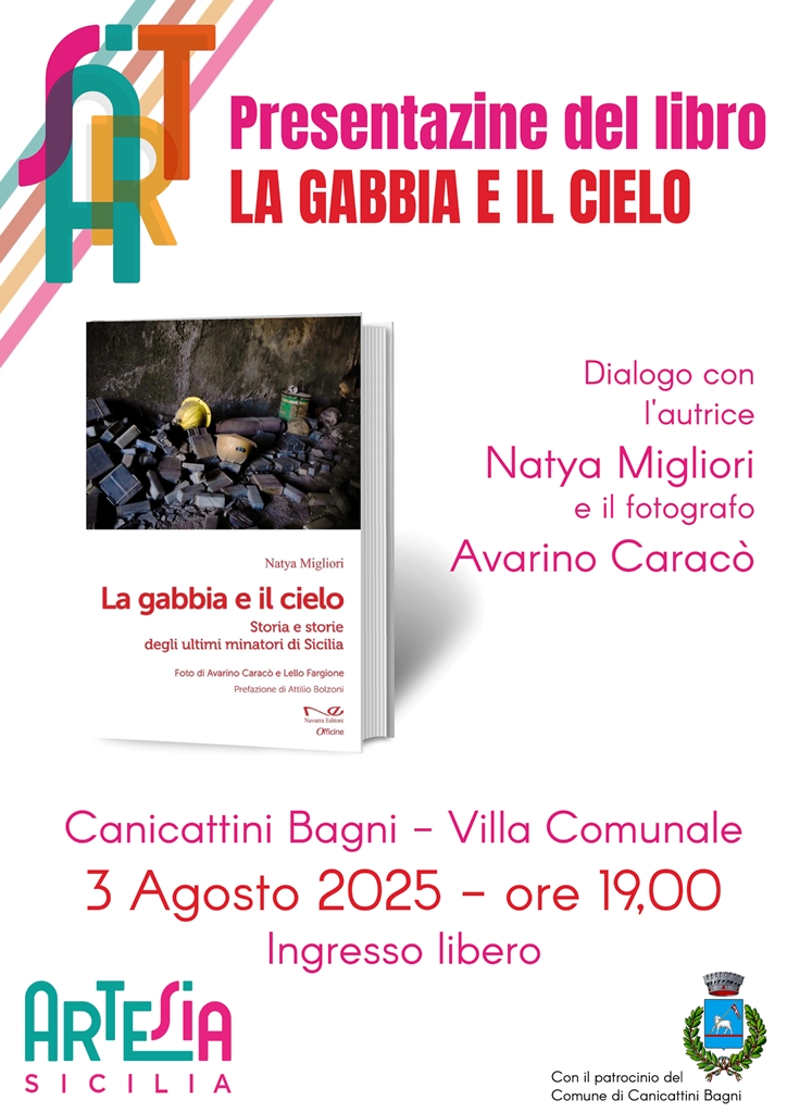 Con la prefazione del giornalista Attilio Bolzoni e il contributo fotografico di Avarino Caracò e Lello Fargione, “La gabbia e il cielo”, è il racconto di un viaggio che Natya Migliori intraprende fra le anse dei fiumi Imera, Platani e Salso, da Riesi a Serradifalco e Casteltermini, alla ricerca degli ultimi minatori di Sicilia e della storia controversa delle miniere di zolfo in Sicilia.