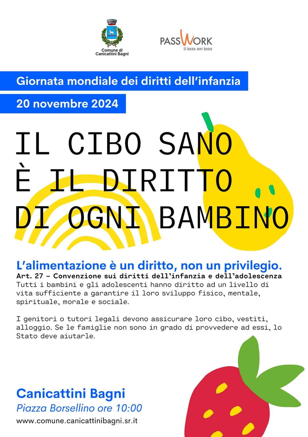 Per il quarto anno consecutivo l’Amministrazione comunale di Canicattini Bagni celebra, mercoledì 20 novembre 2024, in Piazza Borsellino, la Giornata mondiale dei diritti dell’Infanzia e dell’Adolescenza insieme all’impresa sociale Passwork, la Biblioteca comunale “G. Agnello”, le bambine e i bambini dell’Istituto Comprensivo “G. Verga”, la Comunità educante e l’adesione di alcune realtà associative del territorio, con un percorso educativo unico programmato su più incontri.