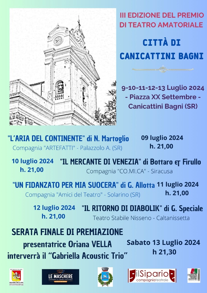 Il Teatro amatoriale e le Compagnie siciliane tornano ad essere protagoniste sul palcoscenico di Piazza XX Settembre, nel centro storico di Canicattini Bagni, in occasione della 3° edizione del Premio Teatro Amatoriale “Città di Canicattini Bagni” promosso dall’Amministrazione comunale in sinergia con le Compagnie teatrali canicattinesi Le Maschere e Il Sipario, e il riconoscimento della FITA, la Federazione Italiana Teatro Amatoriale.