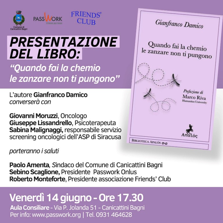“Quando fai la chemio le zanzare non ti pungono” edizioni Apalòs (prefazione di Marco Riva, Humanitas University, e postfazione di Giuseppe Lissandrello), questo il titolo dell’ultimo libro del sociologo e noto life coach siracusano Gianfranco Damico, che venerdì 14 giugno 2024, ore 17:30, si presenta nell’aula consiliare del Comune di Canicattini Bagni di via Principessa Iolanda 51, a cura del locale Friends’ Club e della Coop. Passwork con il patrocinio dell’Amministrazione comunale canicattinese.