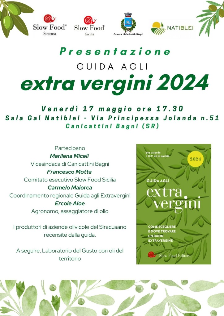Si presenta venerdì 17 maggio 2024, alle ore 17:30, nella sala del Gal Natiblei, in via Principessa Jolanda 51 a Canicattini Bagni, la Guida agli Extravergini di Slow Food Editore giunta alla 24esima edizione.